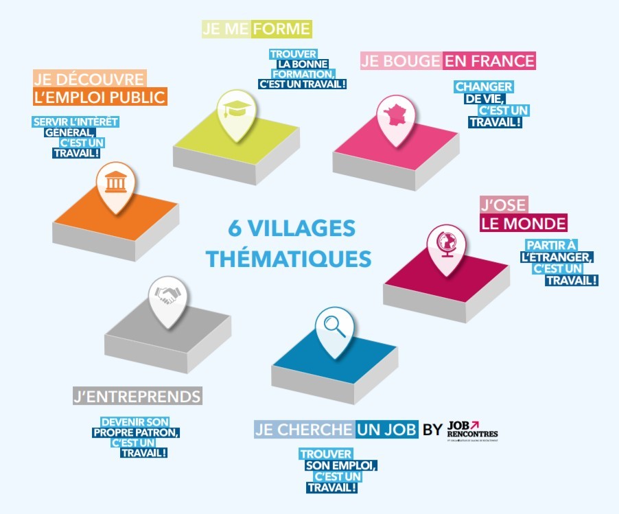A noter que pour l’édition 2019, le Salon du travail et dela Mobilité Professionnelle propose aussi un parcours visiteur participatif avec plus de vingt animations thématiques et places de village : coaching, échange avec des experts, serious games, apprendre à pitcher et à se vendre… avec la volonté d’enrichir l’offre du Salon à des sujets complémentaires et indissociables de la valeur « travail » tels que la santé, le bien-être en entreprise et le handicap… Les six villages thématiques du salon : **Informations Pratiques :**Jeudi 17 janvier 2019 : 10h – 18h