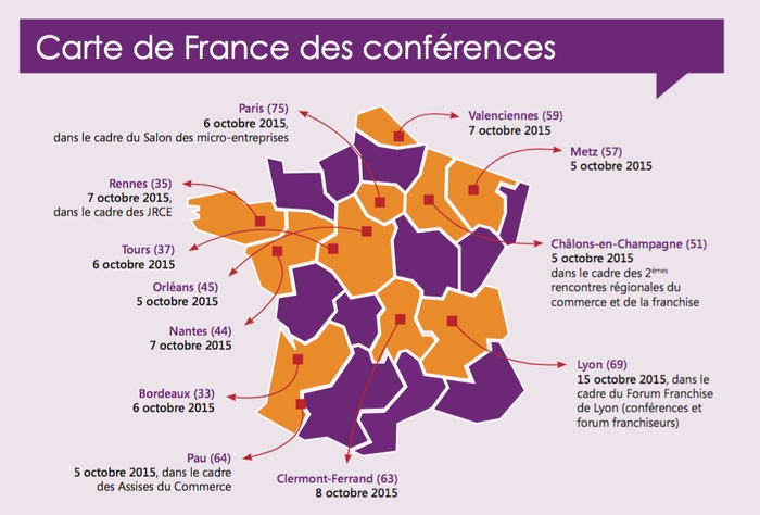 Durant toute la Semaine pour entreprendre en franchise, des évènements sont prévus dans 12 villes françaises. Des conférences co-organisées par les Chambres de Commerce des villes participantes permettront de rencontrer des experts de la franchise et de profiter de l’expérience et de témoignages de franchiseurs et de franchisés. Des franchisés, nommés pour l’occasion Ambassadeurs de la Franchise, ouvriront également les portes de leur point de vente pour recevoir les candidats et partager avec eux leur expérience et leur quotidien de chef d’entreprise franchisé.