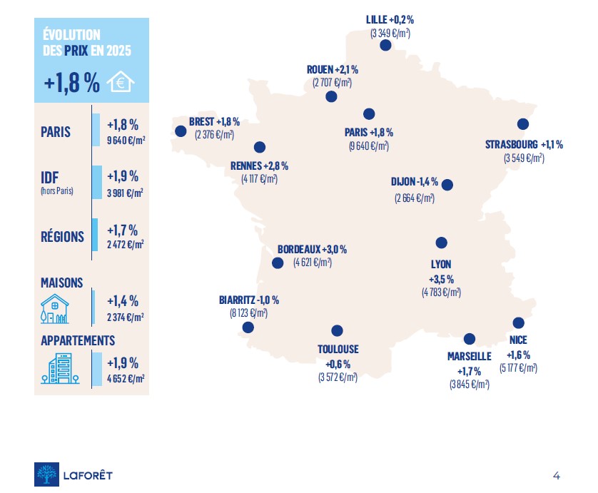Sur les prix, la quasi-stabilité attendue en 2025 pourrait laisser place à une reprise modérée en 2026, autour de +2% en moyenne, avec des dynamiques plus marquées dans les zones ayant le plus corrigé, notamment en Île-de-France.